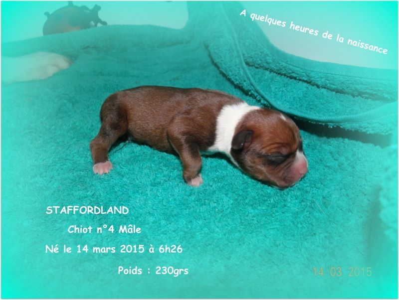 Le chiot n°4 est un mâle de couleur fauve panaché blanc. Il est né le 14 mars 2014 à 6h26. Et il pèse 230grs. D'AUTRES PHOTOS et VIDEOS seront mises régulièrement sur notre site dans l'album photo et vidéo. N'hésitez pas à nous appeler au 06.75.71.99.77.