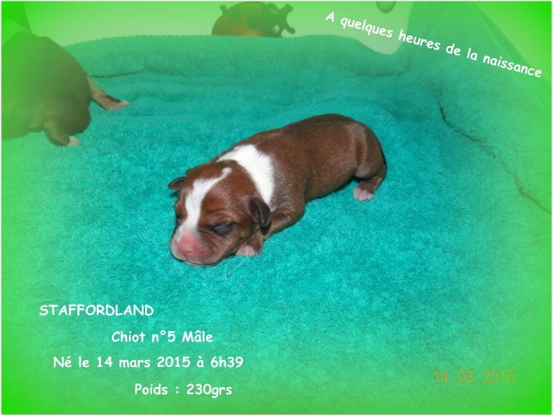 Le chiot n°5 est un mâle de couleur fauve panaché blanc. Il est né le 14 mars 2014 à 6h39. Et il pèse 230grs. D'AUTRES PHOTOS et VIDEOS seront mises régulièrement sur notre site dans l'album photo et vidéo. N'hésitez pas à nous appeler au 06.75.71.99.77.