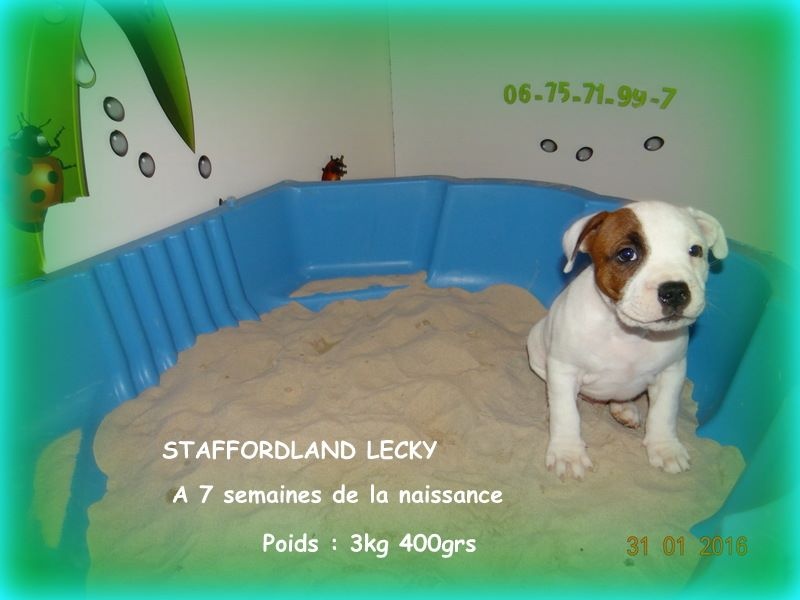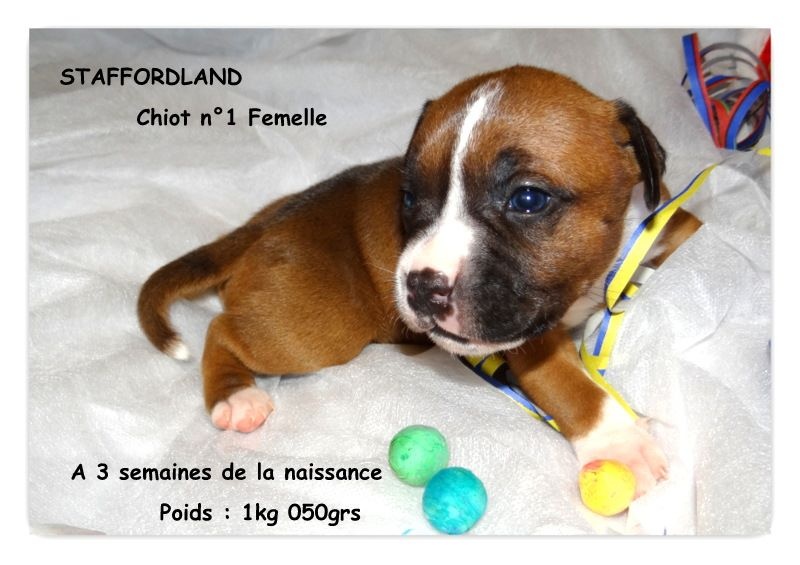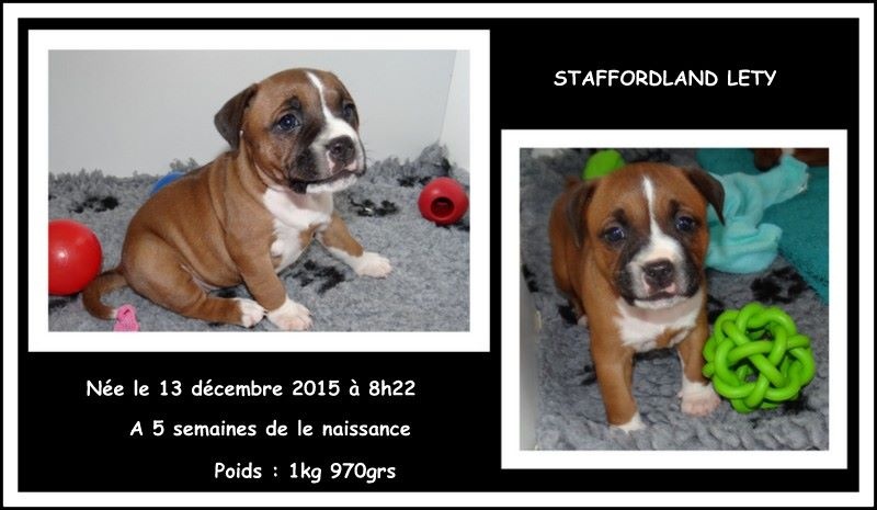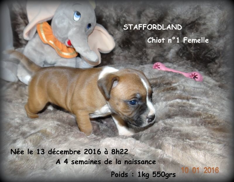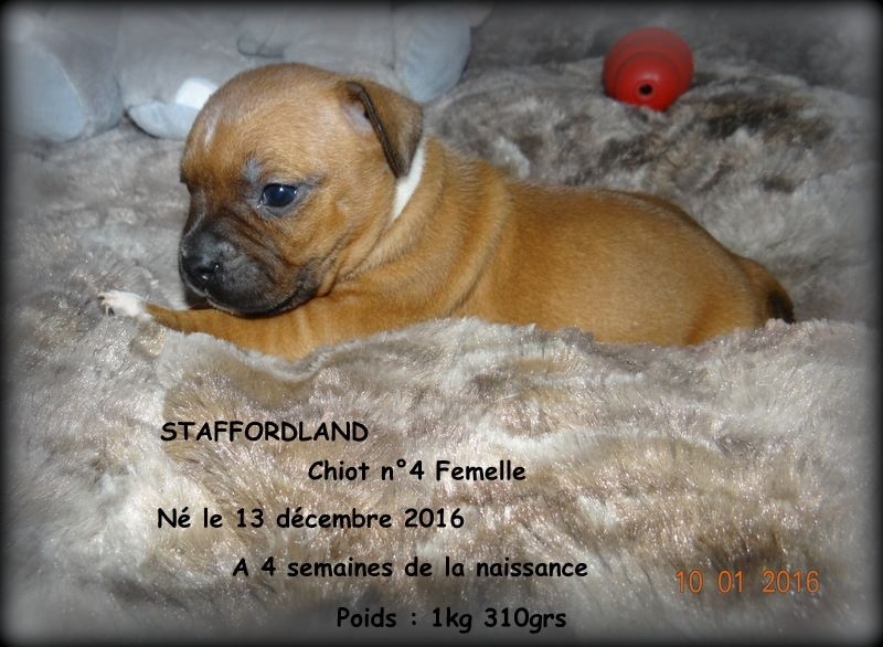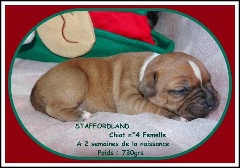 Après une nuit très agitée, Feestje nous a fait 4 magnifiques chiots staffies, deux femelles de couleur fauve panaché blanc et deux mâles de couleur blanc. La maman et ses petits vont très bien
