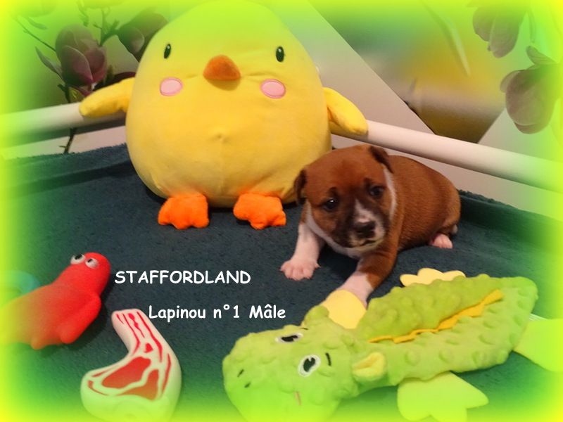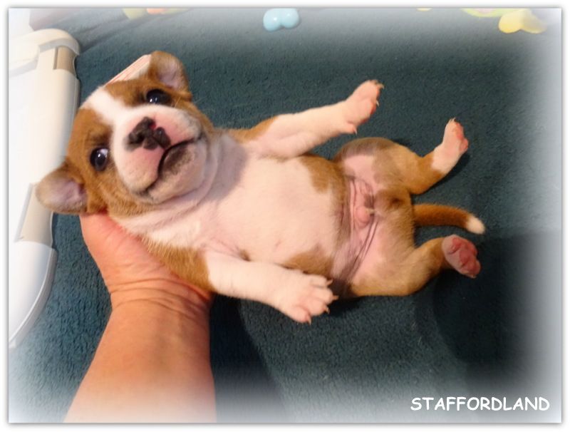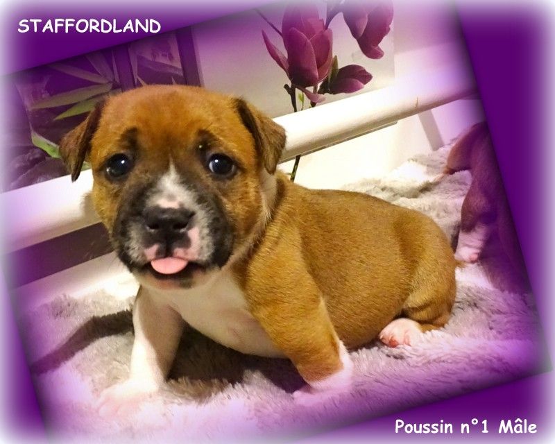 Le chiot Staffordshire Bull Terrier dit Staffi n°1 est un mâle de couleur fauve panaché blanc. Il est né samedi 9 avril 2022 vers 5h du matin. A sa naissance il pesait environ 300grs. Les parents sont OWO NIPA et LANCELOT. D'AUTRES PHOTOS et VIDEOS seront mises régulièrement sur notre site dans l'album photo et vidéo. N'hésitez pas à réserver en nous téléphonant au 06.75.71.99.77. A bientôt