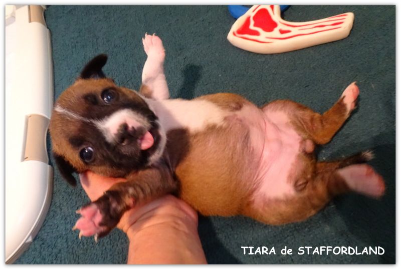 Le chiot Staffordshire Bull Terrier dit Staffi n°3 est une femelle de couleur fauve panaché blanc. Elle est née samedi 9 avril 2022 vers 5h du matin. A sa naissance elle pesait environ 270grs. Les parents sont OWO NIPA et LANCELOT. D'AUTRES PHOTOS et VIDEOS seront mises régulièrement sur notre site dans l'album photo et vidéo. N'hésitez pas à réserver en nous téléphonant au 06.75.71.99.77. A bientôt