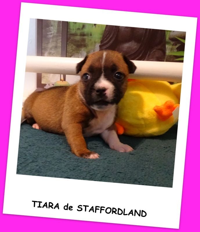 Le chiot Staffordshire Bull Terrier dit Staffi n°4 est une femelle de couleur fauve panaché blanc. Elle est née samedi 9 avril 2022 vers 5h du matin. A sa naissance elle pesait environ 290grs. Les parents sont OWO NIPA et LANCELOT. D'AUTRES PHOTOS et VIDEOS seront mises régulièrement sur notre site dans l'album photo et vidéo. N'hésitez pas à réserver en nous téléphonant au 06.75.71.99.77. A bientôt