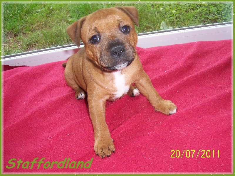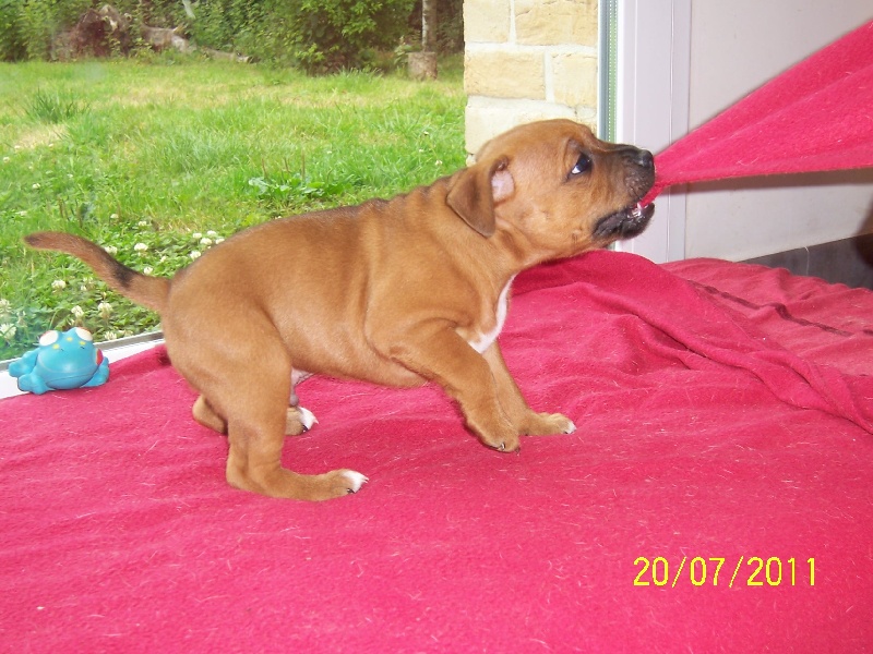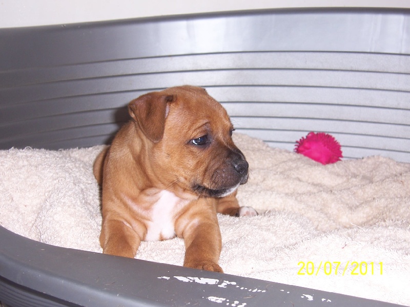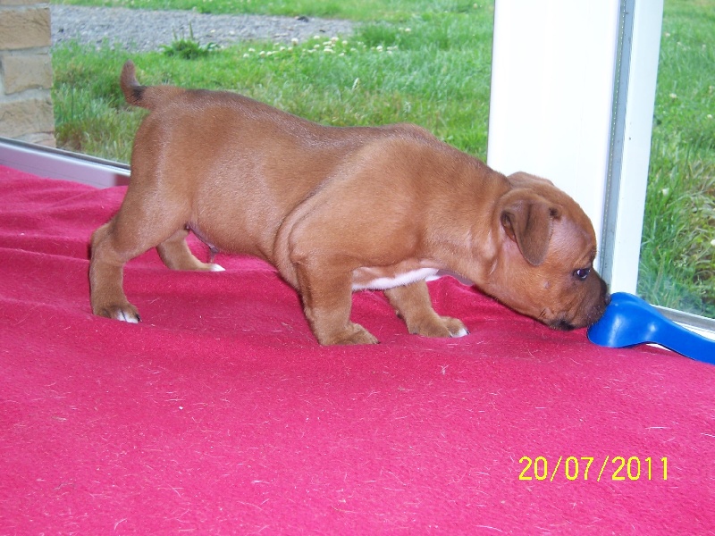 C'est une portée très homogène. Ils seront tous à peu près du même gabarit. Des p'tits durs, des p'tits costauds. Du rouge, du rouge et blanc, pas de grande surprise. Des chiots potelés et bien portants avec une mère bien en forme et qui les bichonne. Une portée royale comme seul Staffordland en a le secret... et BB, elle, connait ce secret ! c'est pour ça qu'elle rit, regardez sa gueule !